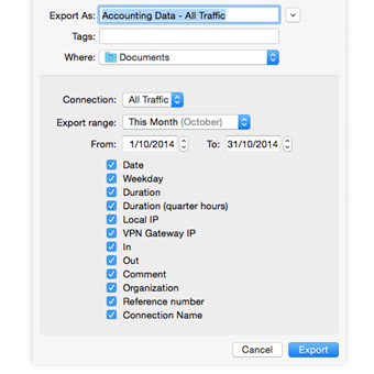 The consultant-focused Accounting Tool in VPN Tracker 365 lets you automatically track for how long you were connected to each client's VPN. At the end of the month, simply export your VPN connection times to your preferred format and you can confidently invoice your clients for your time spent! No more guesswork!