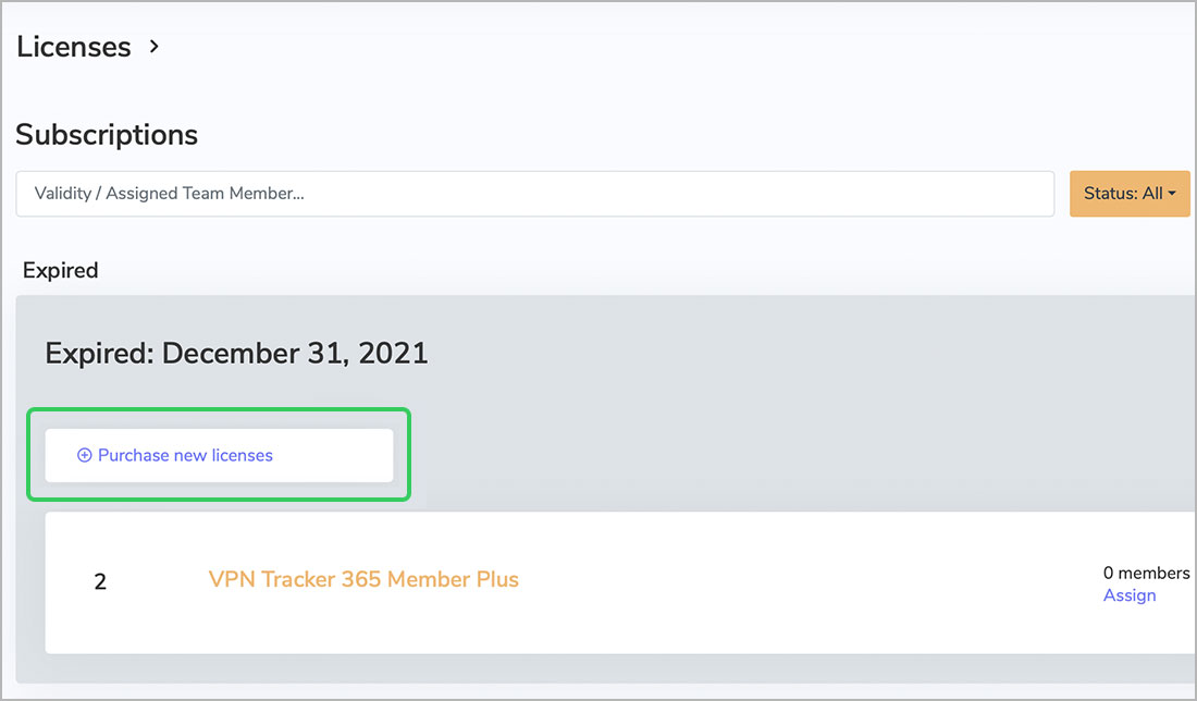 If you are using VPN Tracker as part of a team and have multiple users and licenses, select the Team view. If you are using VPN Tracker as a single user - i.e. without other team members - you will find all of your subscription information in the Personal view under My Subscriptions.