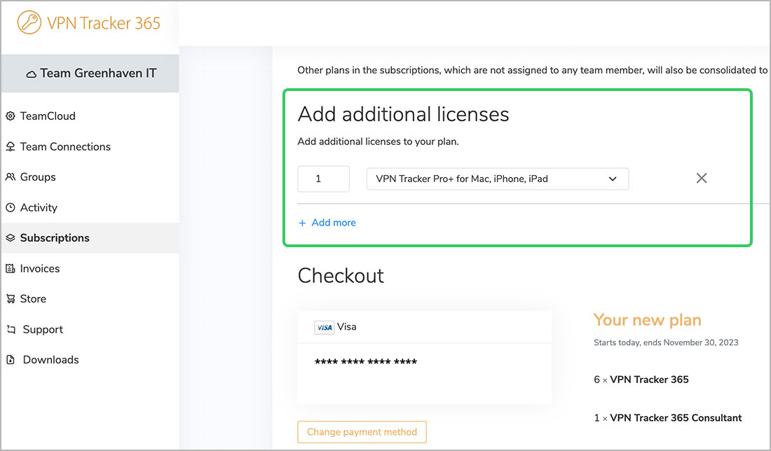 VPN Tracker 365 portal showing option to add additional licenses and checkout with Visa payment for a new plan.
