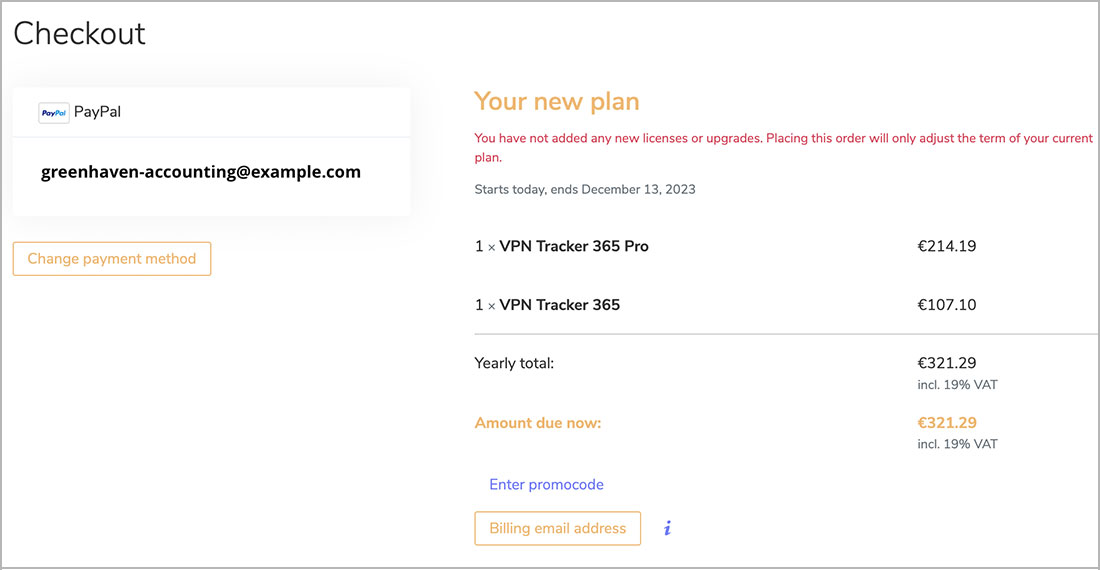 VPN Tracker 365 checkout showing PayPal payment method and new plan summary with VPN Tracker 365 Pro and VPN Tracker 365.