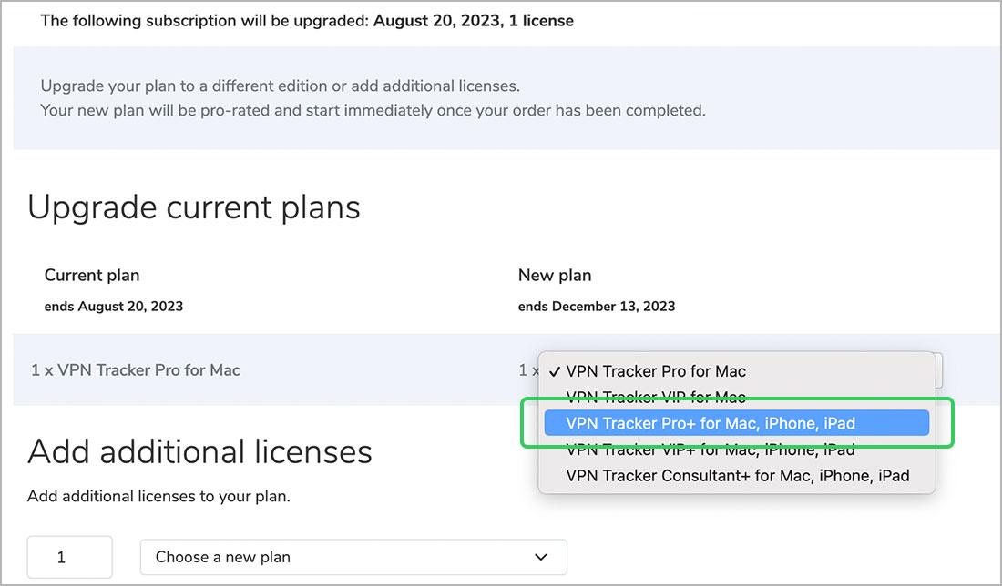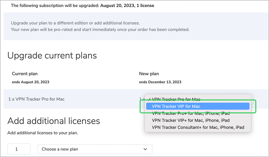 Go to the Cross-Upgrade Store, select a new VPN Tracker edition to upgrade to and the remaining balance of your old plan will be pro-rated to your new plan.