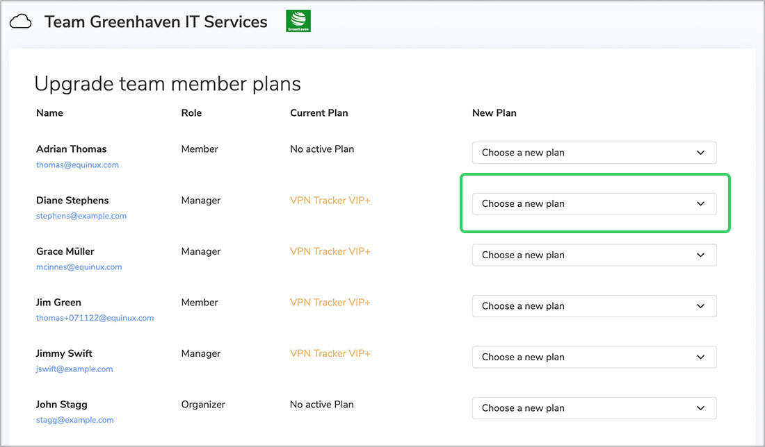 my.vpntracker portal showing team member plan upgrades for multiple users with option to choose a new VPN Tracker Plan