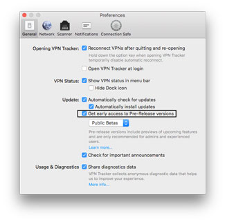 Just turn on Pre-Release Updates in VPN Tracker and choose whether to automatically install them, or whether you'll update manually. It's up to you! |