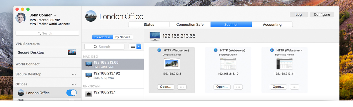 PRO VIP CONSULTANT VPN Tracker 365 VPN Scanner lets you find and connect to devices on remote VPN networks. Need to access a server or check if the right services are running? The built-in network scanner for Mac gives you a complete overview of all devices on a VPN connection, including operating systems and available services for direct access. Save time, scan VPN networks instantly, and get the job done faster. |